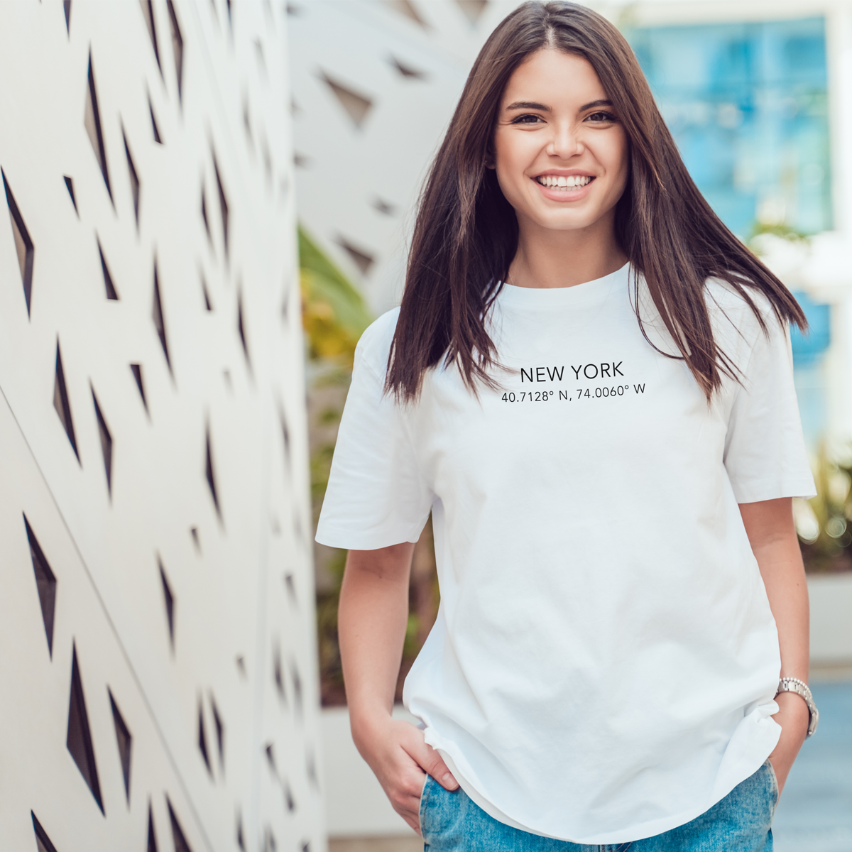 Mit der schlichten Aufschrift „New York“ und den entsprechenden geografischen Koordinaten wird das „New York“ T-Shirt zu einem Symbol für die pulsierende Metropole. Es verkörpert den einzigartigen Charakter und die Faszination dieser Stadt, die unzählige Herzen erobert. Das T-Shirt ist für alle, die eine Leidenschaft für Reisen haben, insbesondere für diejenigen, die bereits in dieser faszinierenden Stadt waren oder dorthin reisen möchten. Es ist ein Ausdruck der Liebe zur Stadt, die niemals schläft, und verleiht jedem Outfit einen Hauch von Stil und Individualität.